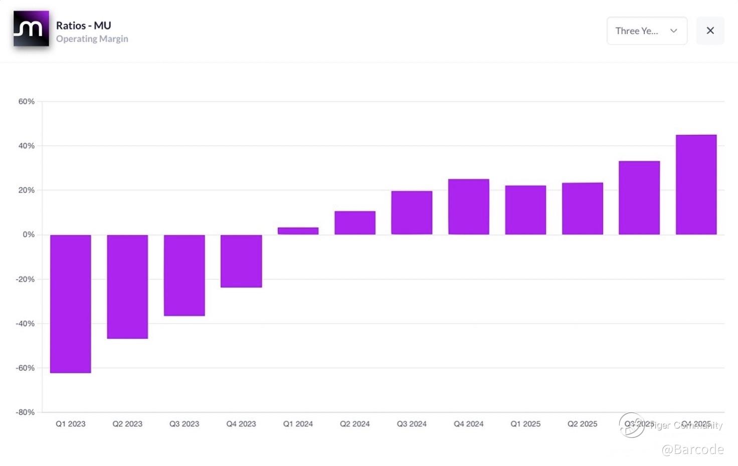 Across 12 quarters, operating margins inverted from -62.3% to +44.9%. That scale of transition reflects disciplined supply, mix optimisation, and sustained demand, not cyclical noise.