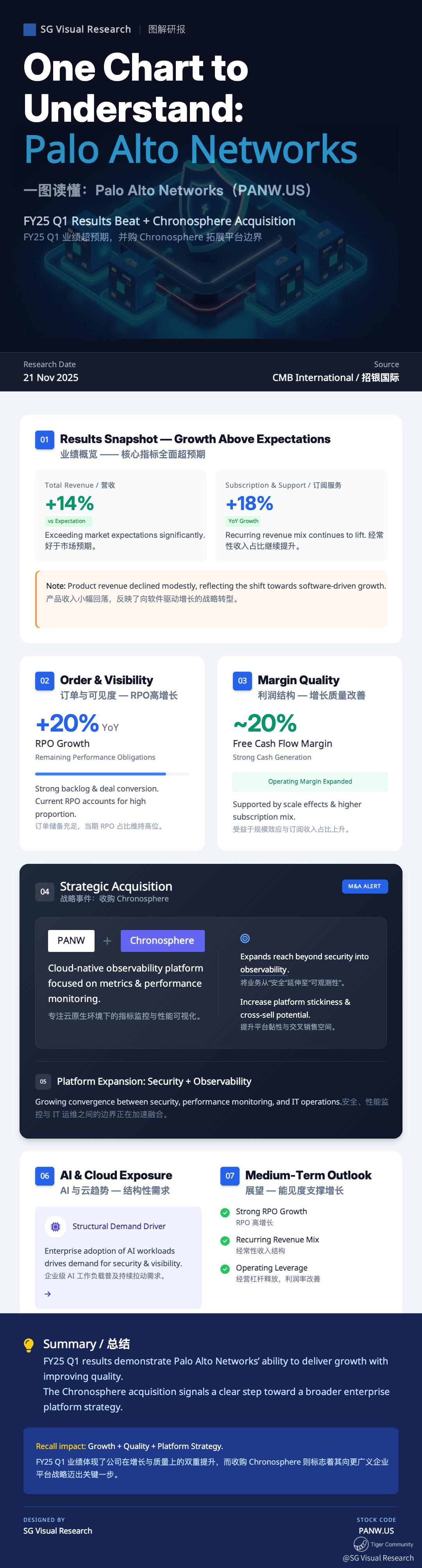 Alongside solid subscription growth and stronger RPO visibility, PANW announced the acquisition of Chronosphere — a move that extends the platform beyond security into observability, especially for cloud-native and AI workloads.