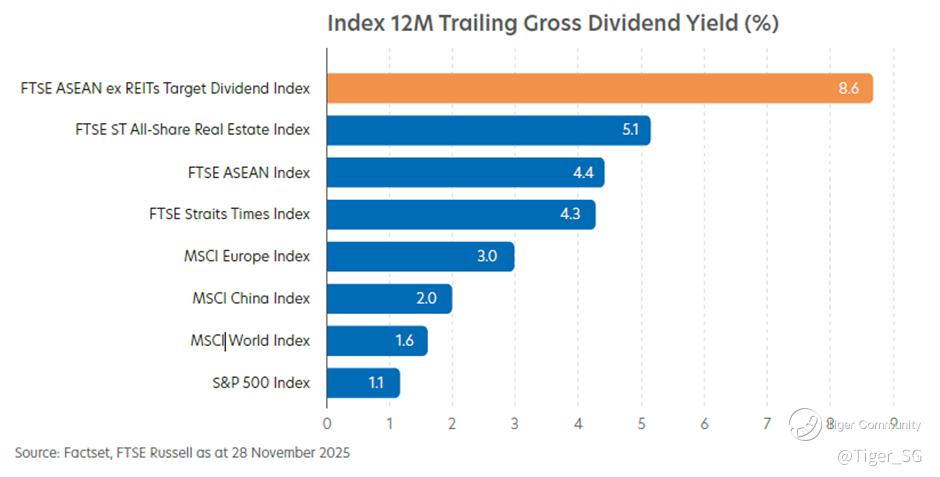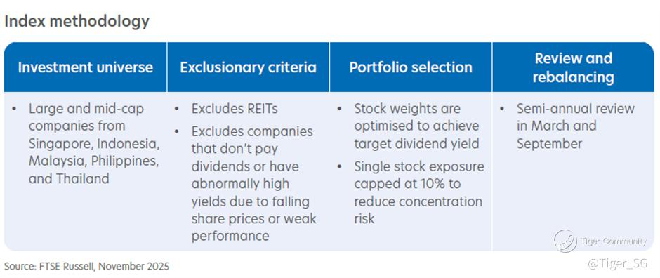 The Index was launched on 3 October 2025 and aims to offer double the dividend yield compared to the underlying FTSE ASEAN Index by allocating higher weights to stocks with stronger dividend yields. As of 28th November 2025, the gross dividend yield of the Index is 8.6% p.a. compared to 4.4% p.a. for the FTSE ASEAN Index.