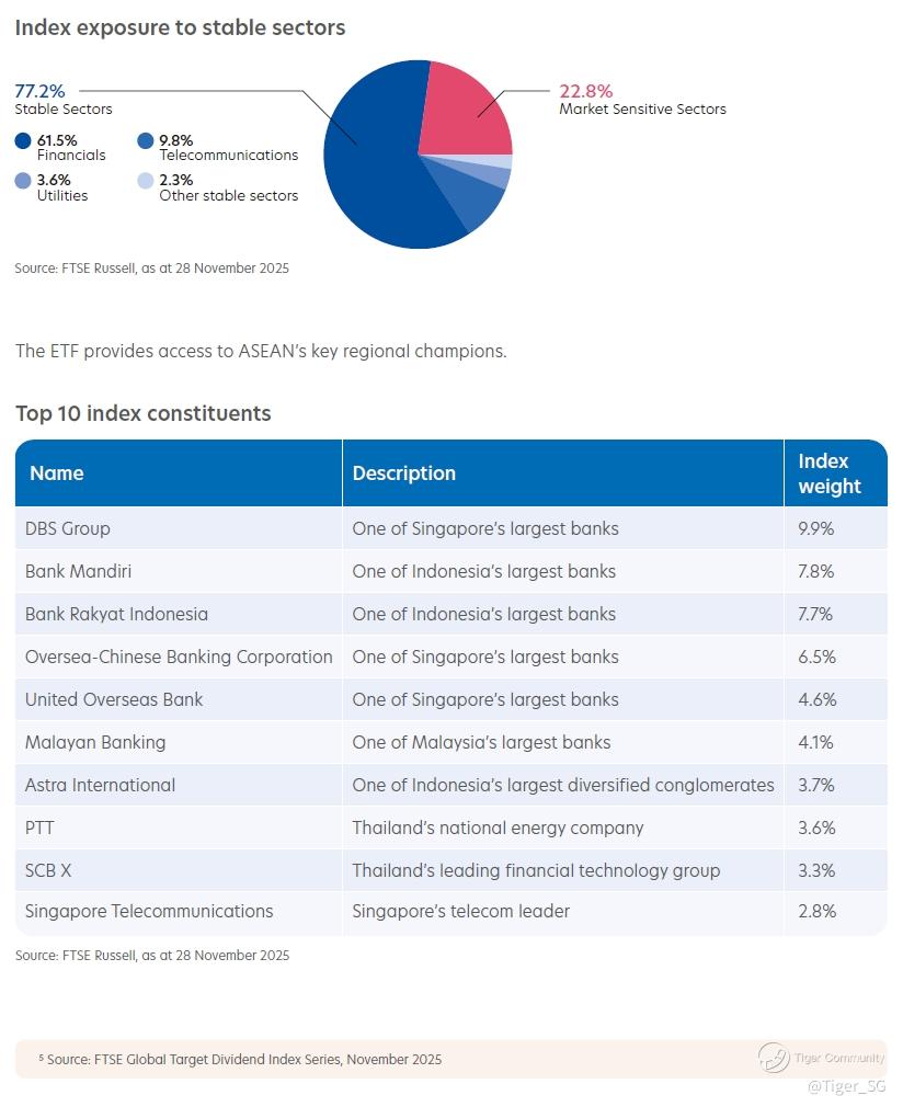 The Index focuses on ASEAN’s regional champions, companies with strong fundamentals and proven dividend track records5. It provides exposure to leading companies across five key ASEAN markets — Singapore, Malaysia, Indonesia, Thailand, and the Philippines — with significant allocations to stable, income-generating industries like Financials, Telecommunications, and Utilities to help reduce portfolio risk.