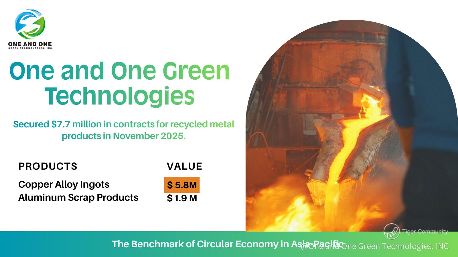 One and One Green Technologies, Inc. $One and one Green(YDDL)$ , a premier producer of recycled non-ferrous metals based in the Philippines, announced that it signed contracts totaling $7.7 million for its recycled metal products in November 2025. This represents a significant increase of $3.2 million compared to the same period last year, underscoring the robust demand for recycled materials among industrial customers in the Asia-Pacific region.