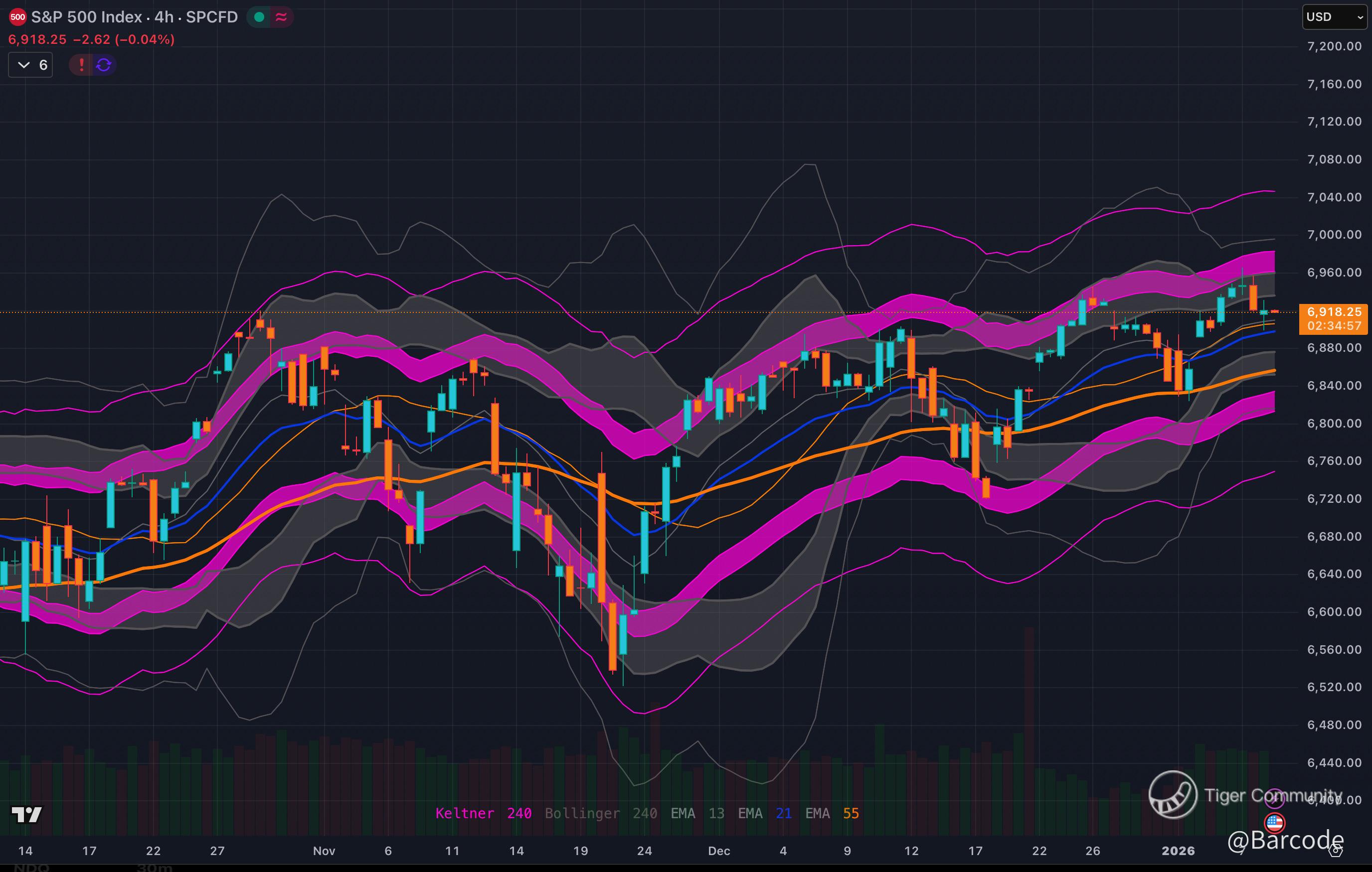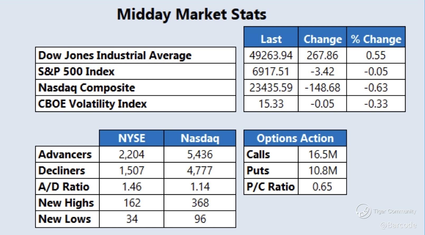 $S&P 500(.SPX)$ $Dow Jones(.DJI)$ $SPDR S&P 500 ETF Trust(SPY)$ 08Jan26 ET 🇺🇸 | 09Jan26 NZT 🇳🇿 Midday check in. I’m tracking a controlled volatility unwind with rotation under the surface. $DJI +267.86 or +0.55% at 49,263 as cyclicals and defense drive index recovery after yesterday’s risk reset. $SPX flat at 6,917, pinned by gamma and index hedging, while $IXIC -148.68 or -0.63% reflects tech rotation rather than broad risk-off. Volatility continues to leak lower with $VIX at 15.33, confirming no stress impulse.