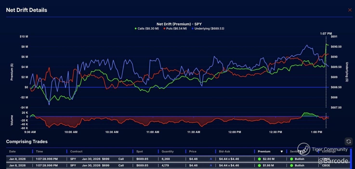 Options flow is reinforcing the dip-buying regime. Total volume shows 16.5M calls versus 10.8M puts with a 0.65 put call ratio. 🚨 I’m also seeing $4M+ in single-leg, opening bullish call flow hit the tape in $SPY, targeting the 30Jan26 expiry at the $699 strike, roughly 1.36% OTM. That positioning confirms upside intent, active liquidity, and dealer gamma sensitivity into the afternoon session.