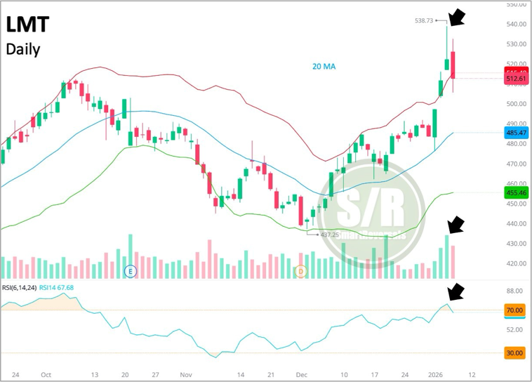 The news simply served as a trigger for an overbought condition. The $Lockheed Martin(LMT)$ chart is a textbook example of this, showing a shooting star pattern printed above the Bollinger Band, validated by strong daily volume and an RSI reading above 70. This technical setup suggests the news merely provided a catalyst for a healthy pullback that was already highly probable. Once the price returns to the Bollinger range there can be bullish continuation.