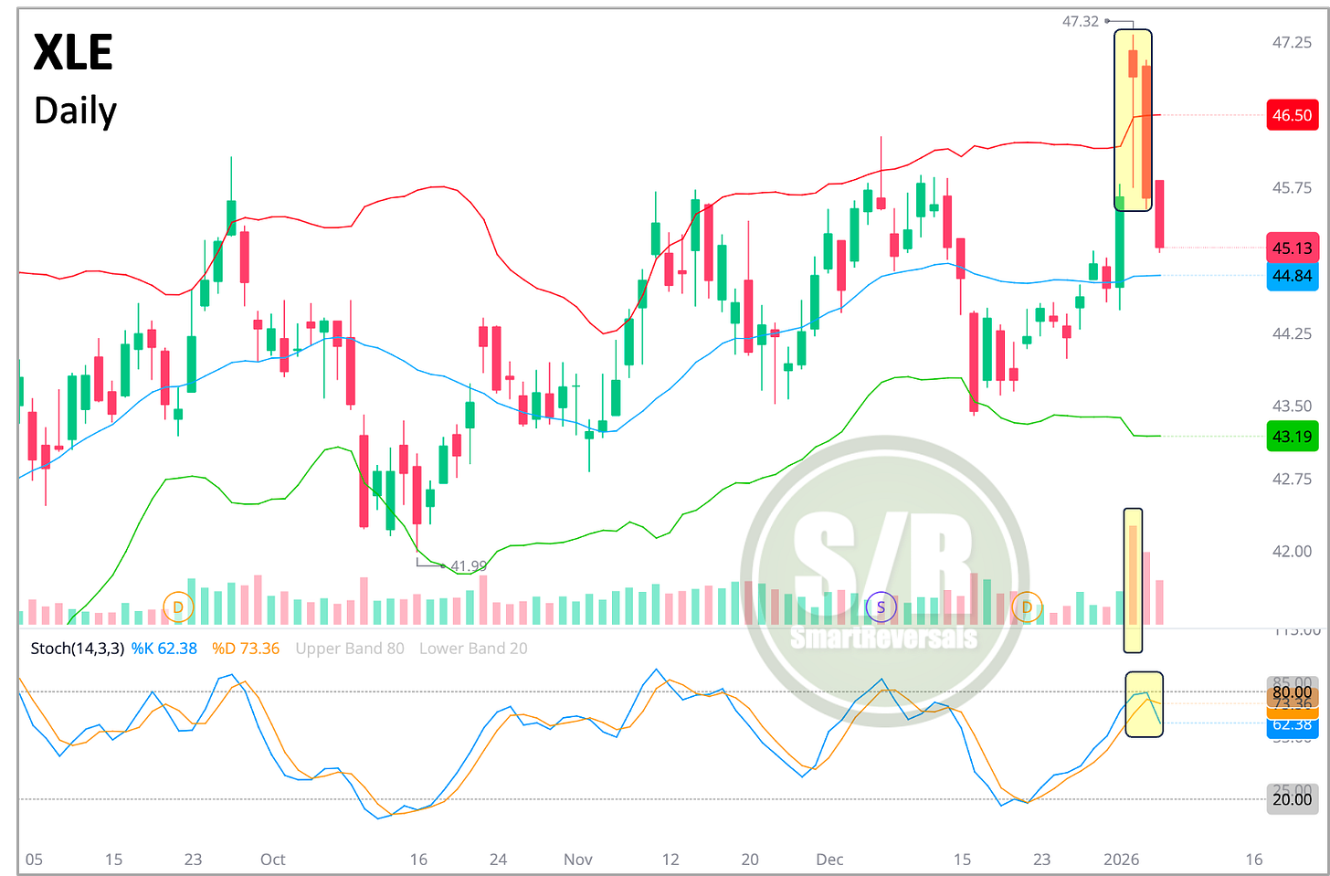 When observing the technical chart for $Energy Select Sector SPDR Fund(XLE)$ (energy sector ETF), the bearish candle printed on Monday above the Bollinger Band and validated by high volume offered a reasonable anticipation of a pullback. Sector ETFs typically respect technical indicators, and these overbought conditions usually lead to a reversal. If you see the charts for $Chevron(CVX)$ and $Exxon Mobil(XOM)$ , they are identical to this one below.
