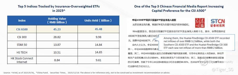 The A500 Index ETF has become a top A-share allocation choice for long-term institutional capital such as insurance companies. According to Wind, as of the 2025 interim report, insurance institutions held RMB 45.23 billion in ETFs tracking the CSI A500—ranking first among all indices and far ahead of others.