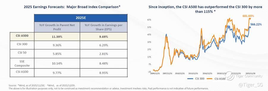 The CSI A500 Index—often referred to as the “S&P 500 of A-shares” selects 500 large and liquid companies across all major sectors to reflect the broad performance of China’s most representative industries. Its methodology emphasizes industry balance and quality selection, filtering constituents by free-float market capitalization, Stock Connect eligibility, and stringent liquidity criteria to enhance both stability and growth potential. The index also offers significantly broader market coverage than traditional A-share benchmarks, representing 56% of A-share free-float market capitalization and 64% of total earnings. The index also demonstrates stronger earnings growth in comparison with other major broad-based indices, reflecting the higher profitability and growth potential of its constituent sectors. Over the long term, the CSI A500 has also outperformed the CSI 300. Since inception, its cumulative return has exceeded the CSI 300 by over 115%. Year-to-date, it has delivered a 21.34% total return, nearly 3 percentage points ahead of the CSI 300, underscoring its sustained enhancement effect.^