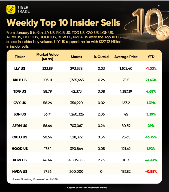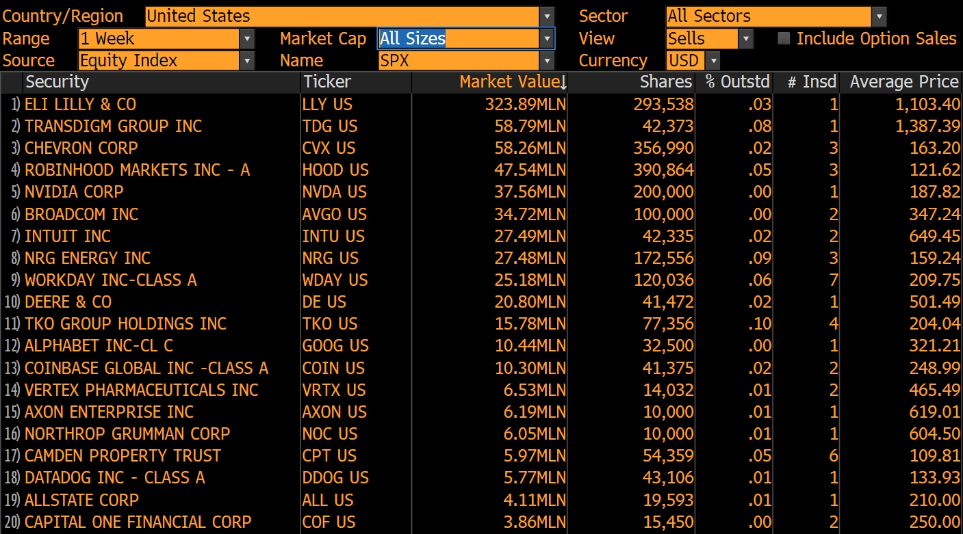 Firstly, the top 10 insider stock sales, ranked by amount, were $Eli Lilly(LLY)$ , $Rocket Lab USA, Inc.(RKLB)$ , $TransDigm(TDG)$ , $Chevron(CVX)$ , $Legence Corp.(LGN)$ , $Affirm Holdings, Inc.(AFRM)$ , $Oklo Inc.(OKLO)$ , $Robinhood(HOOD)$ , $Redwire Corp.(RDW)$ $NVIDIA(NVDA)$