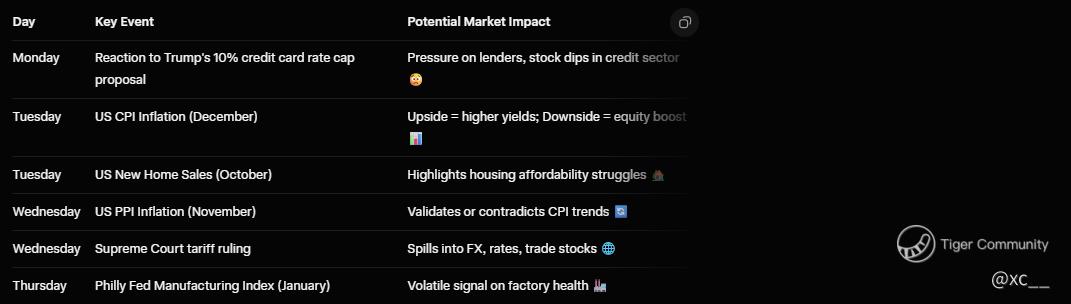 Overall, forget sleepy growth tales—this week's all about raw policy risks, inflation clues, and headline shocks. Sensitivity spikes in rates, USD pairs, banking giants, and credit-focused names. Volatility? Guaranteed around those releases and any breaking news. Stay nimble, diversify, and watch those charts! 📈⚠️