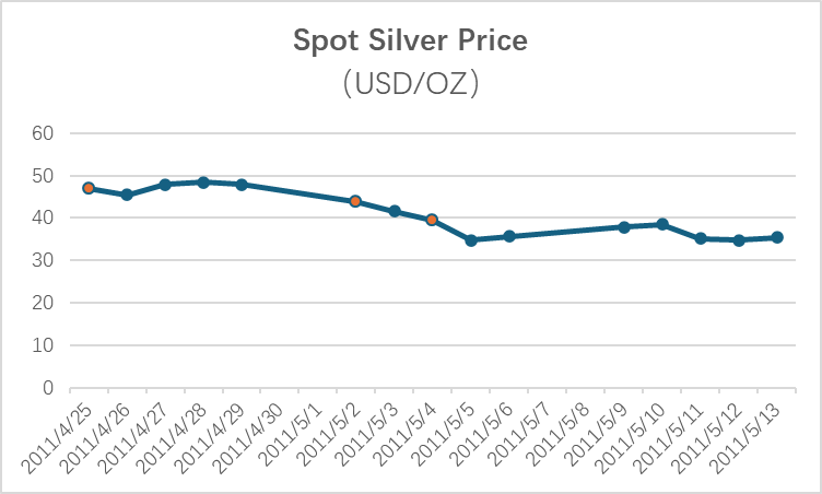 Between April and May 2011, silver prices surged rapidly, reaching an all-time high of nearly USD 50 per ounce in late April to early May. The rally was soon followed by a sharp collapse, driven by overheated speculative sentiment and a series of regulatory actions by the exchange.