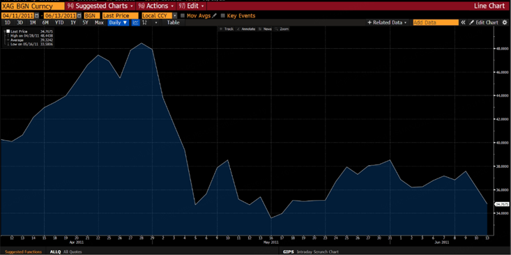Prices surged rapidly in late April, reaching a peak close to USD 50 per ounce, before suffering a sharp decline in early May.