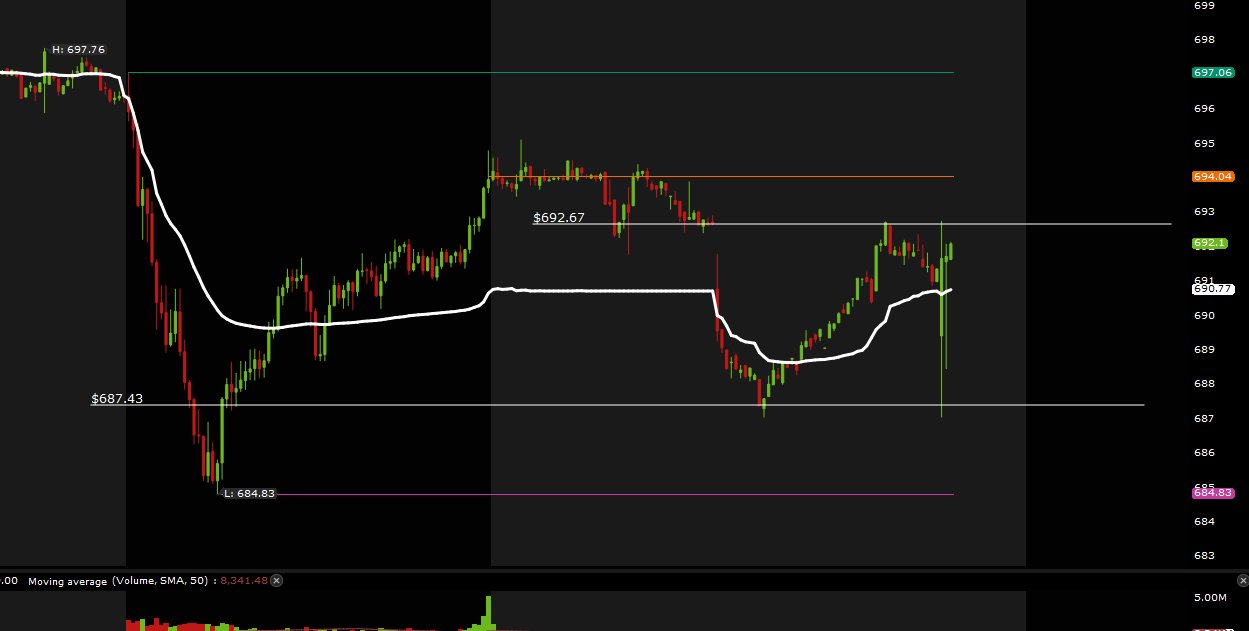 The SPY will have to clear above yesterday's close at $695 if it wants to go higher today and rememeber premarket high is at $692.70.