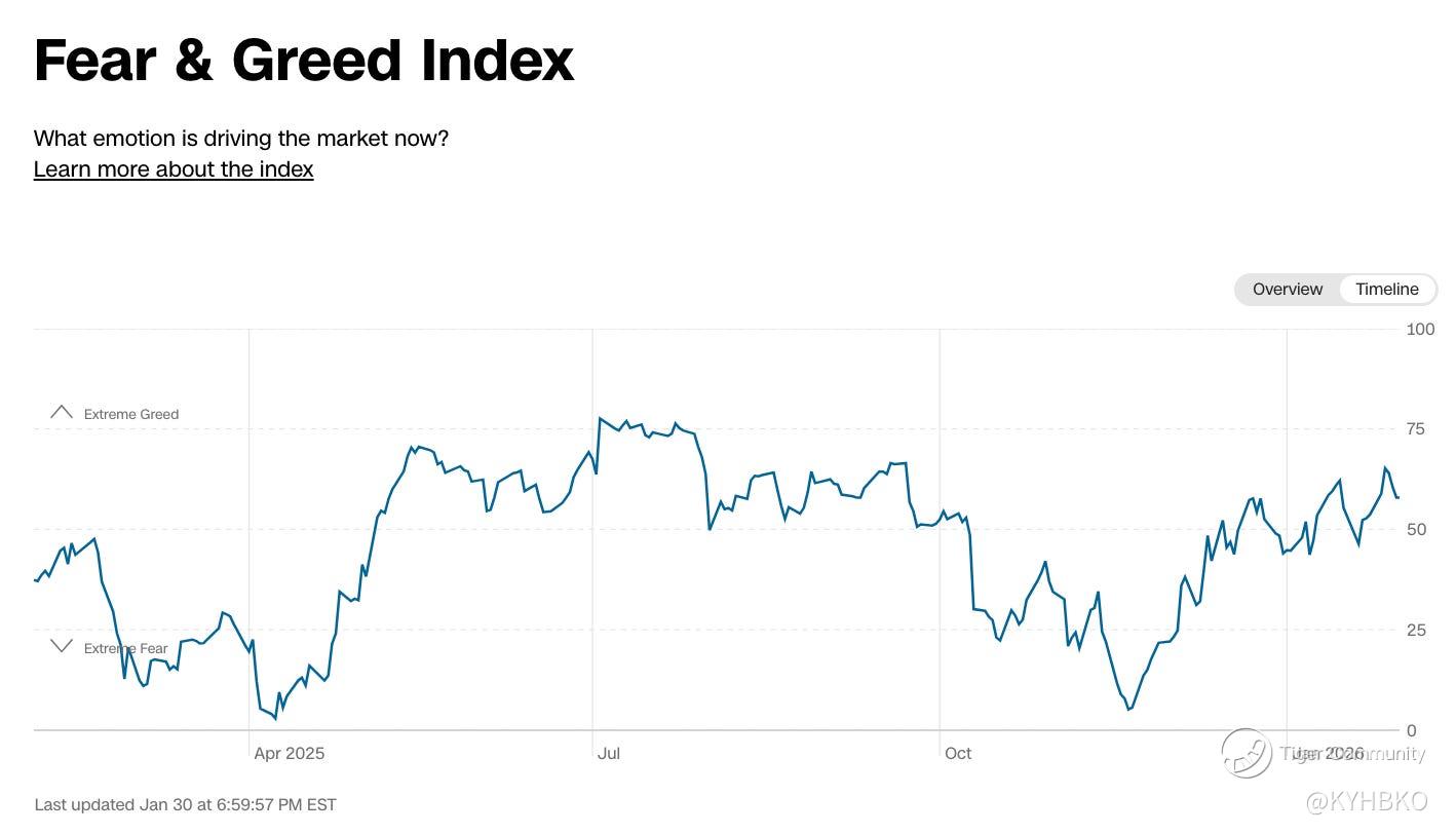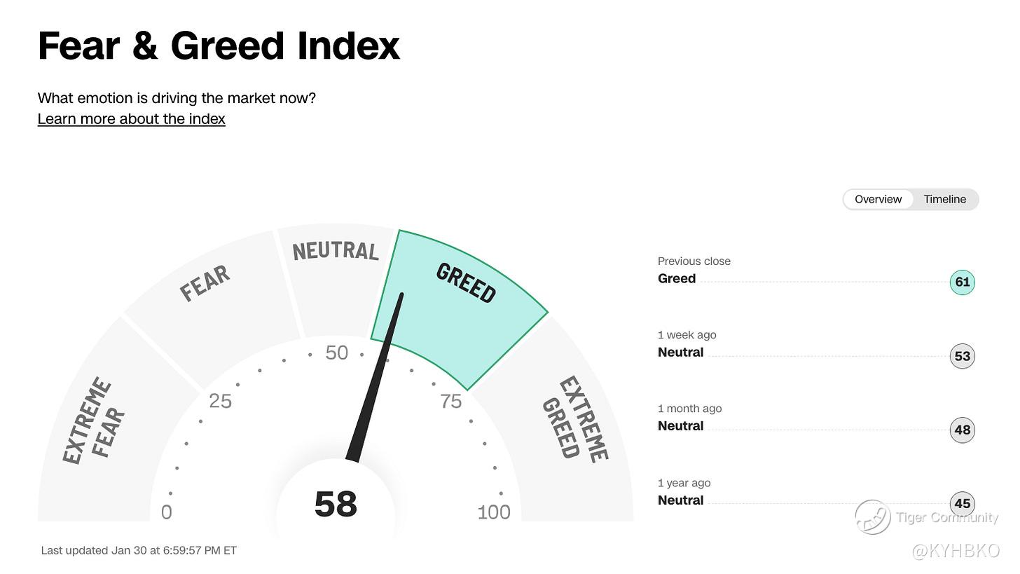 The market has risen into the “Greed” region, with an index score of 58 (up from last week’s score of 53).