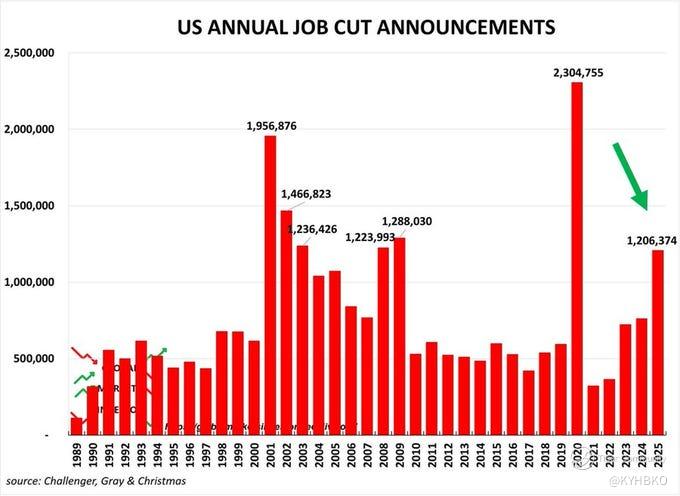 US layoffs have surged to recessionary levels: US employers announced 1,206,374 job cuts in 2025, up +58% YoY, the highest since the 2020 Crisis. Excluding 2020, this was the worst year since the 2008 Financial Crisis. - X user Global Markets Investor