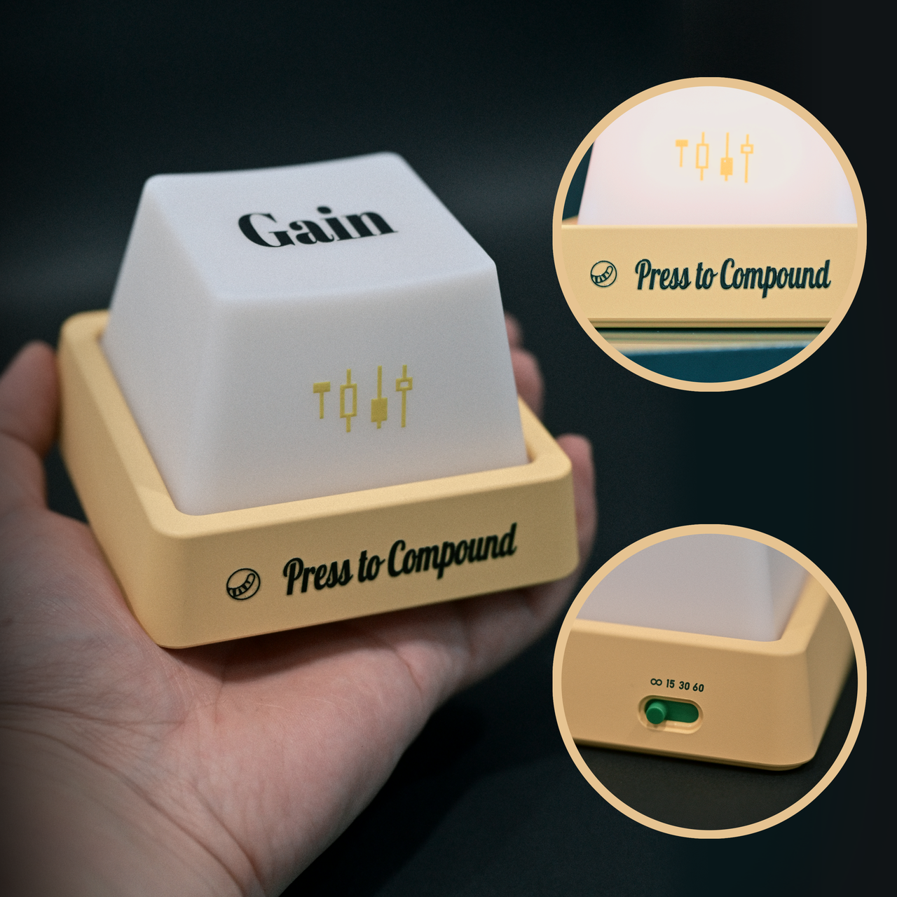 Design & Features: Eye-catching "Gain" keycap with the slogan "Press to Compound"; tap to turn on soft, eye-friendly warm light, crafted with a stable non-slip base, compact and space-saving for desks or bedside tables.