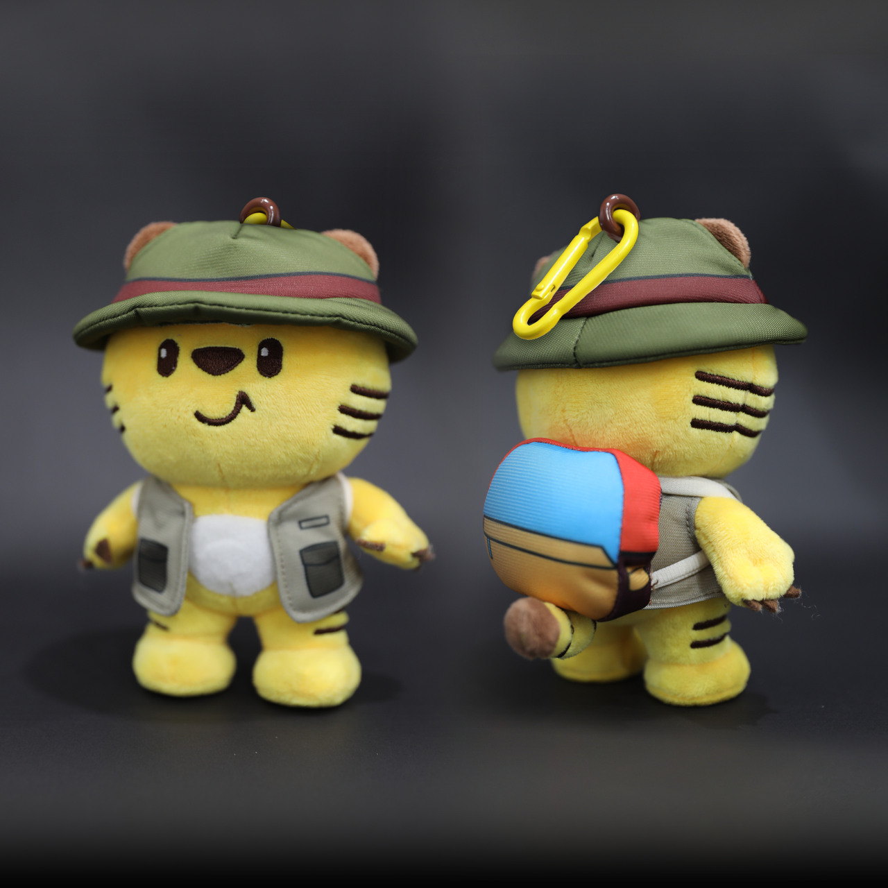 Design & Features: Outdoor adventure design with an explorer hat and multi-pocket durable canvas vest; the red-brown color block on the hat adds retro outdoor vibes, light and portable for hanging on bags (15cm/100g).