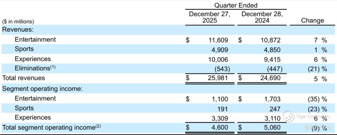 The quarter was characterized by "revenue growth without profit growth." While revenue rose 5% to $26 billion, total segment operating income fell 9% to $4.6 billion. Adjusted EPS dropped 7% to $1.63, primarily driven by increased content and marketing expenditures in the Entertainment sector.