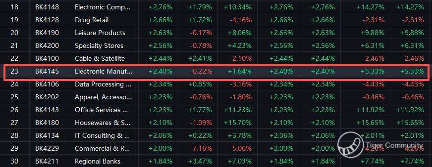 The best-performing concepts is Electronic Manufacturing Services. Considering the different perceptions of the stock, this time TigerPicks chose $TTM Technologies Inc(TTMI)$ $Sanmina(SANM)$ $Benchmark Electronics(BHE)$ $Plexus(PLXS)$ $Flex Ltd(FLEX)$ $Jabil Circuit(JBL)$ $IPG Photonics(IPGP)$ $Fabrinet(FN)$ $TE Connectivity(TEL)$ $Celestica(CLS)$ to have a fundamental highlight to help users understand it better.