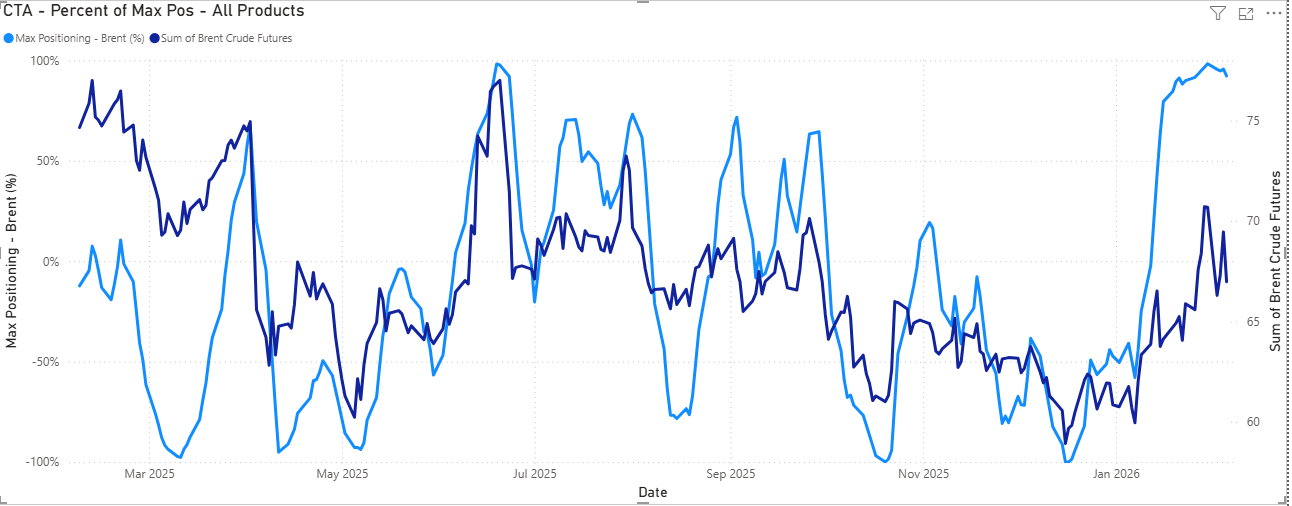 On the other hand, CTA has been accumulating lengths over the 1 to 1.5 mths, flipping to max long positions now. Should Brent move down to about 66/bbl level, in my view we will start to see the momentum/trend driven CTA starting a wave of selling (2nd Pict).