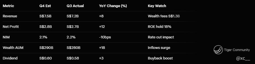 • Q4 est S$2.8B profit up 12%, revenue S$7.5B +8%.