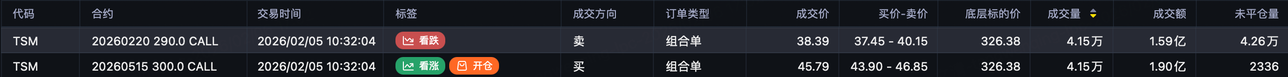 TSMC also saw a roll, albeit conservative—the strike was raised from 290 to 300 $TSM 20260515 300.0 CALL$ . The valuation repair process is expected from Q1 into Q2. View the upside cautiously.