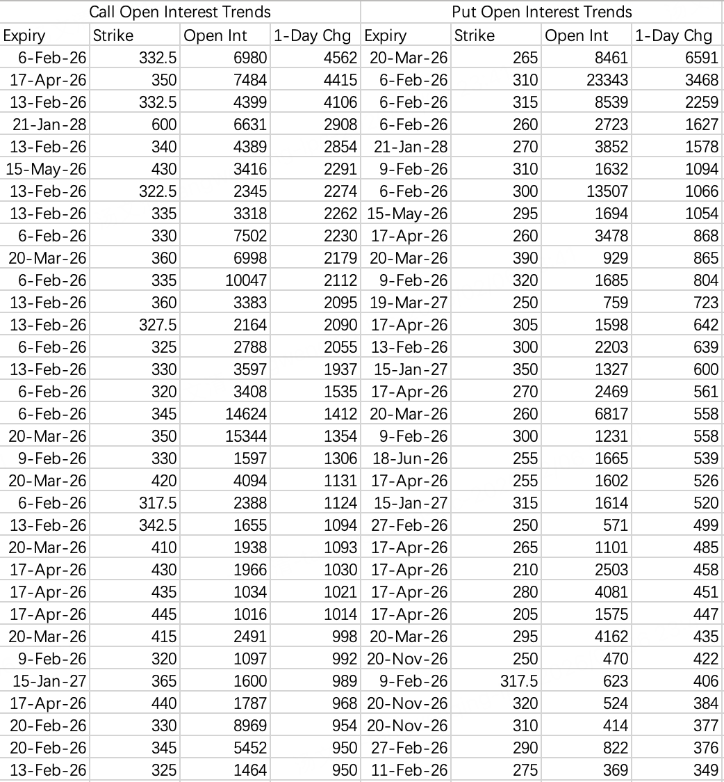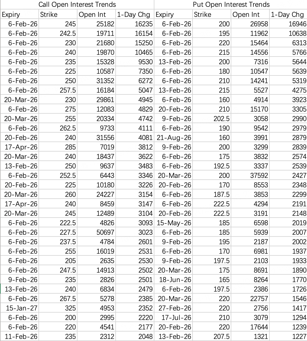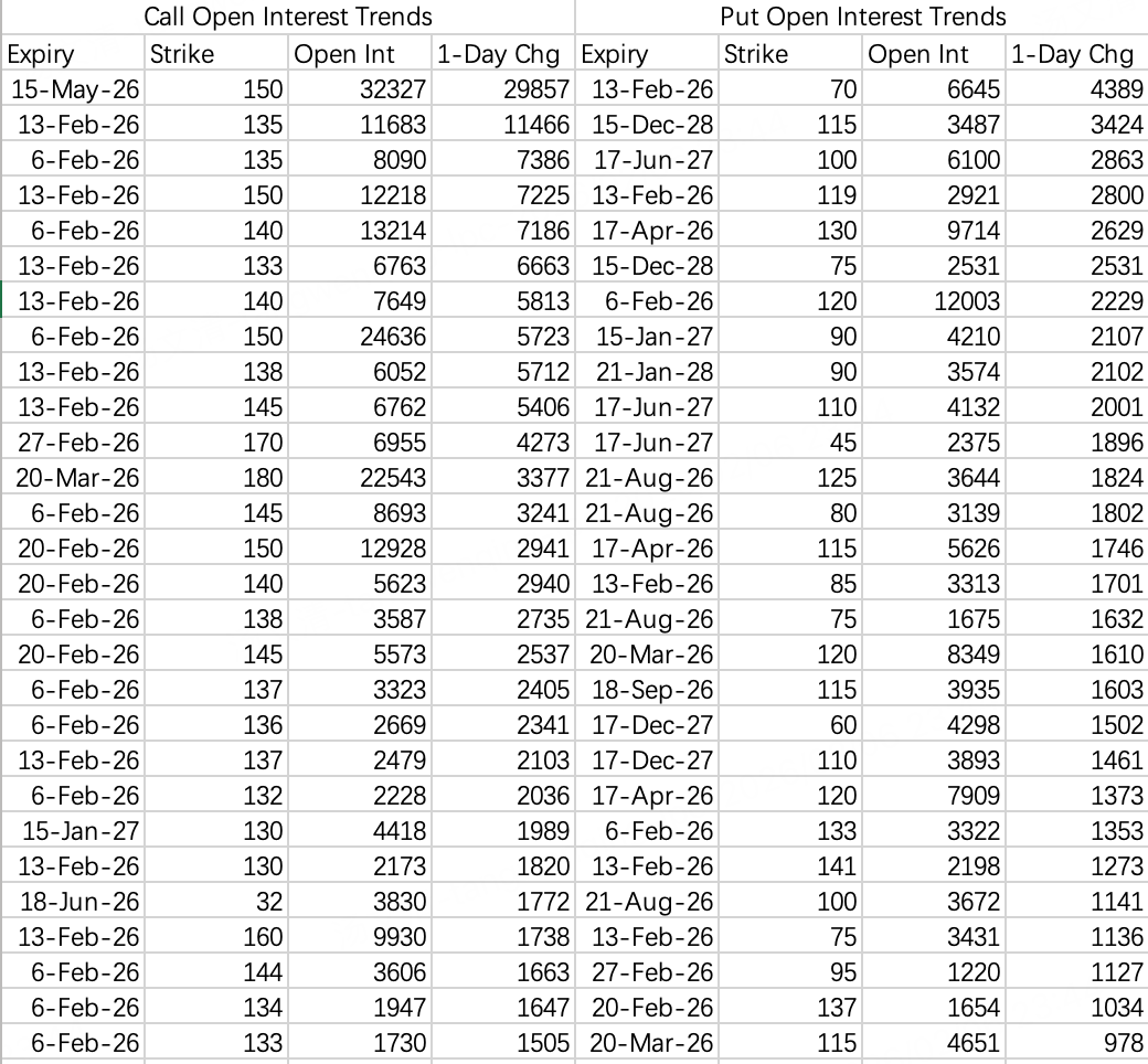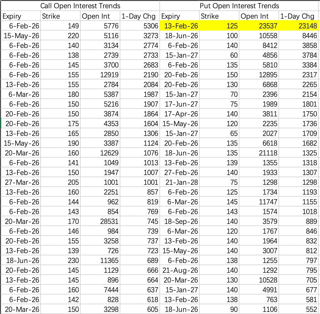 Similar to NVIDIA, there's a large weekly expiry bearish order: $ORCL 20260213 125.0 PUT$ , with remarkably similar trade characteristics. Also expected to continue correcting next week.