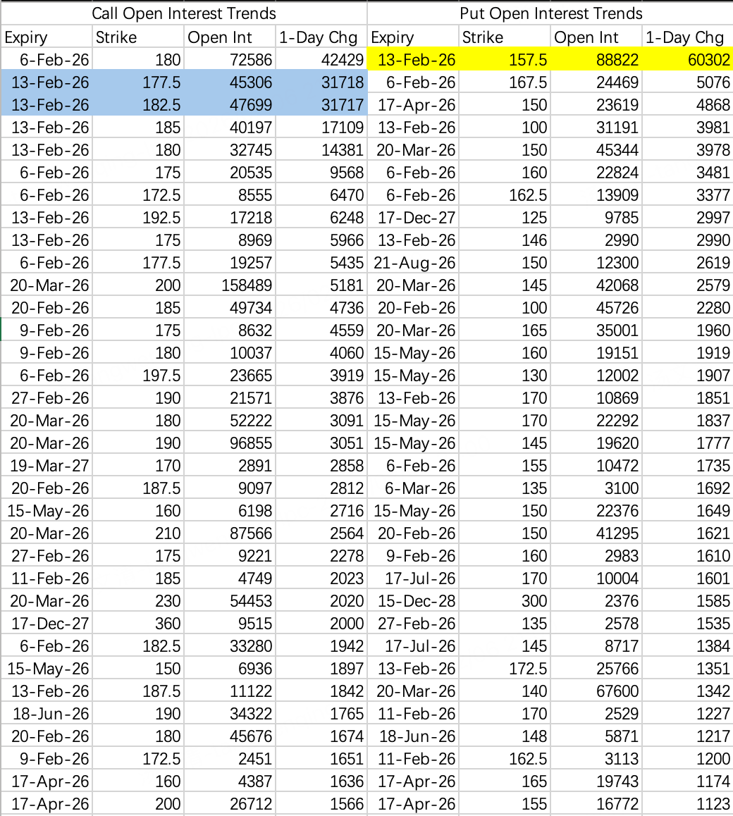 Next week continues the search for a bottom. A large bearish order opened: the weekly expiry 157.5 put $NVDA 20260213 157.5 PUT$ , with 60,000 contracts for a total notional of over $6 million.