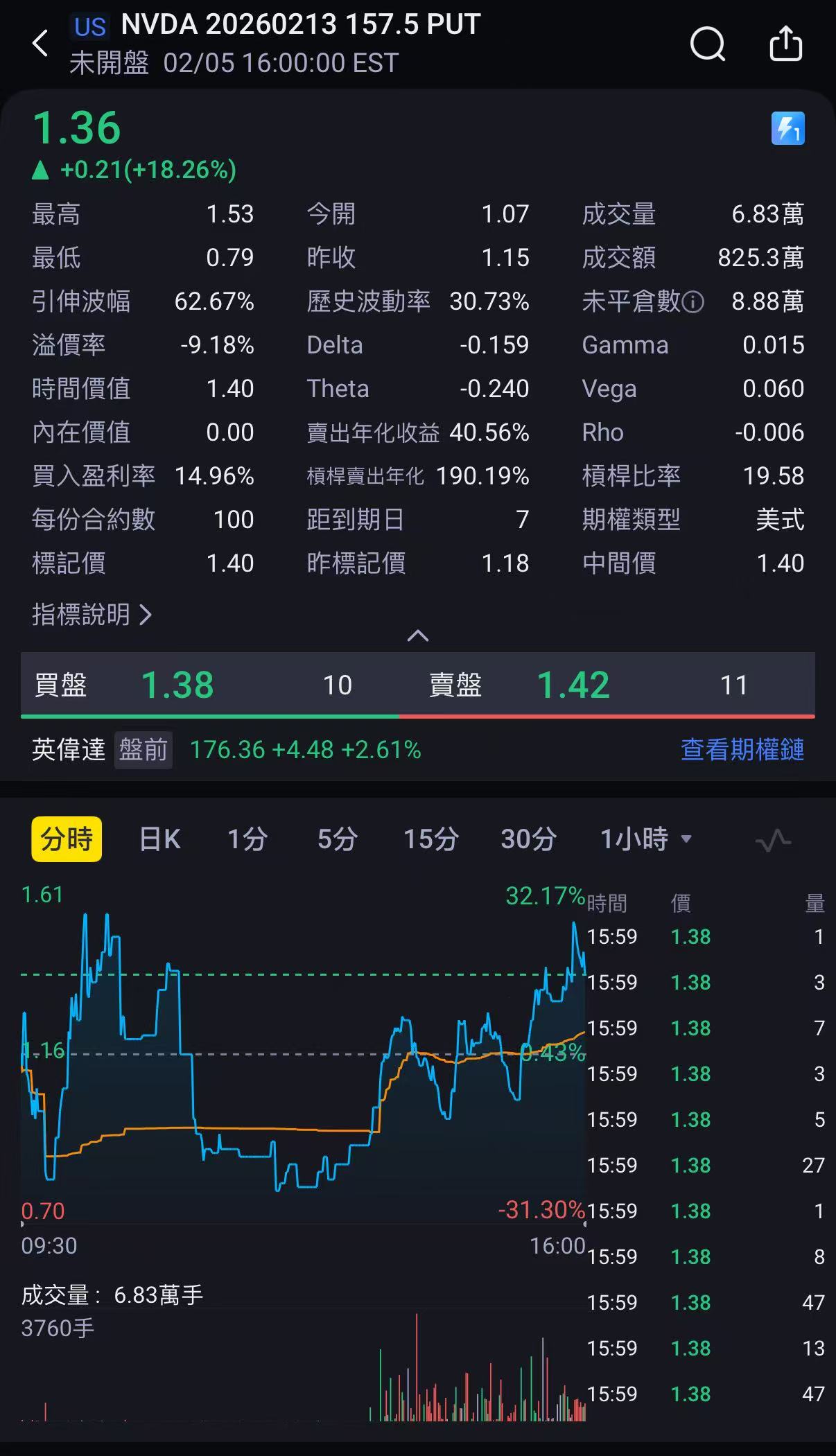 (Screenshot of volume for the 157.5 put $NVDA 20260213 157.5 PUT$ would be inserted here).