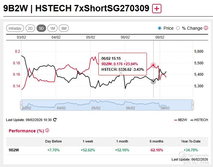 Meanwhile, broader market sentiment was more muted. The $HSTECH(HSTECH)$ fell -6.5% over the same period, while the broader $HSI(HSI)$ dropped -3.0%.The $HSTECH 7xShortSG270309(9B2W.SI)$ was up about 24% due to volatile trading during the week, while the $HSTECH 7xLongSG270331(YPCW.SI)$ was down about 22%.
