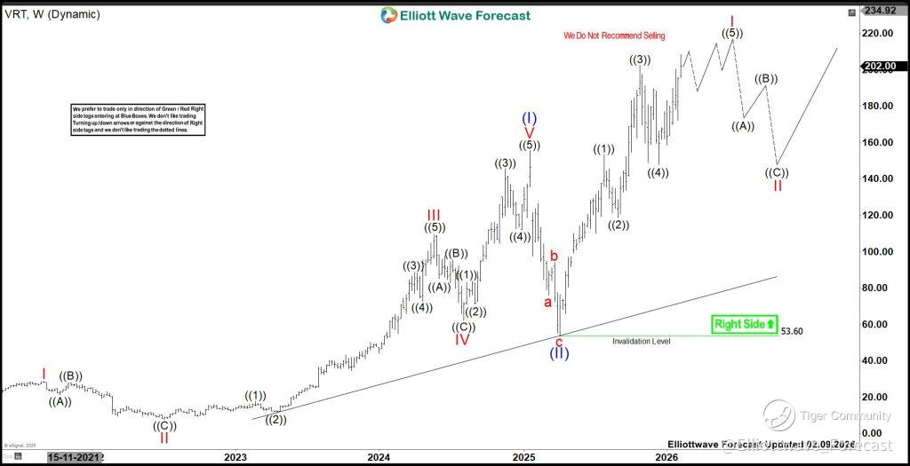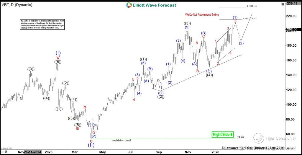 VRT favors bullish sequence in weekly & favors rally within April-2025 sequence. It favors rally in ((5)) to end the diagonal Elliott Wave in I, while above 12.17.2026 low. It favors rally into $215.5 – $232.1 area to end I before correcting next.