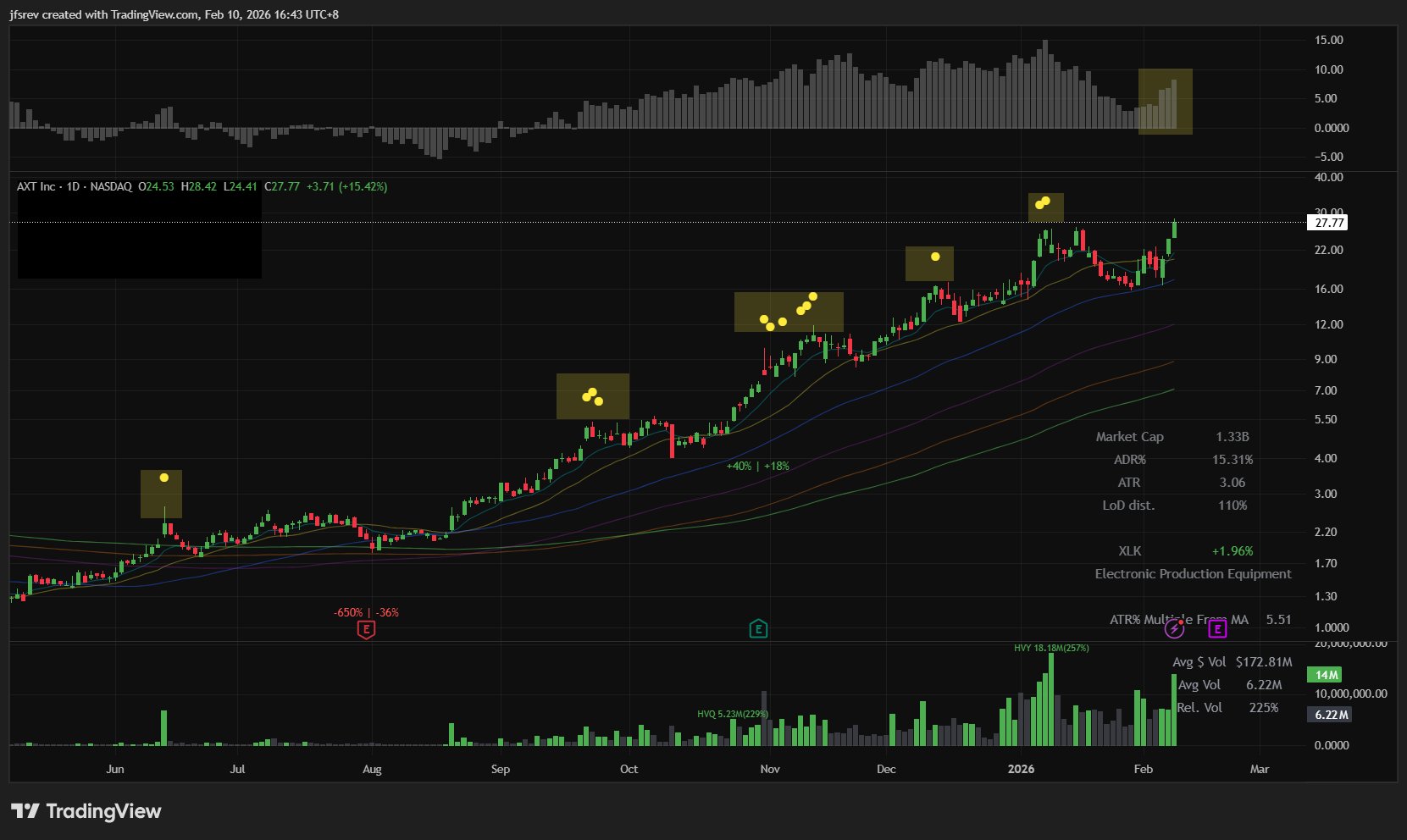 $AXT Inc(AXTI)$ is in a strong trend with VARS and has a history of pulling back from 10× ATR% from the 50-MA since recapturing it's 200-MA in January 2025.