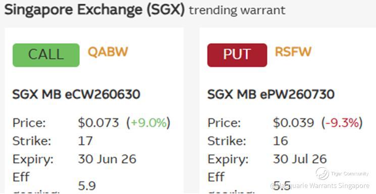 ✳Trending SGX call warrant $SGX MB eCW260630(QABW.SI)$ which had seen demand ahead of its earnings result, has consequently gained five times more – by +32.1% to SGD 0.074