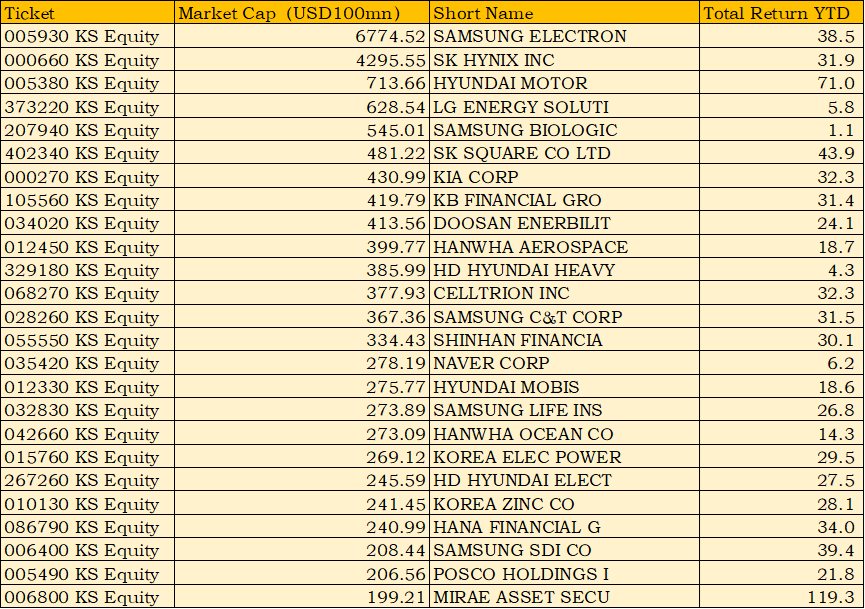 Beyond excessive weighting of mega-caps, South Korean companies also hold extensive cross-shareholdings. For example, SK Square—South Korea's sixth-largest company by market cap—is a major shareholder of SK Hynix, having gained nearly 44% this year; Kia Corporation—the seventh-largest—is a subsidiary of Hyundai Motor, while also holding a small stake in Hyundai, with gains exceeding 32% YTD; Samsung C&T, valued at $36.7 billion, also holds a minor stake in Samsung Electronics, surging over 31%: