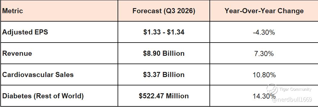 Diabetes Recovery: Expected revenue of $522.5 million (ROW) and growth of roughly 11.5%. With recent FDA clearances and Medicare expansion for the MiniMed 780G, investors want to see if Medtronic can continue clawing back market share from competitors.