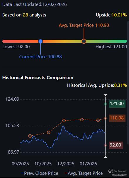 The stock currently holds a "Moderate Buy" consensus with a target price of approximately $111. Technically, the stock is trading near $101, comfortably above its 200-day moving average of $96.22.