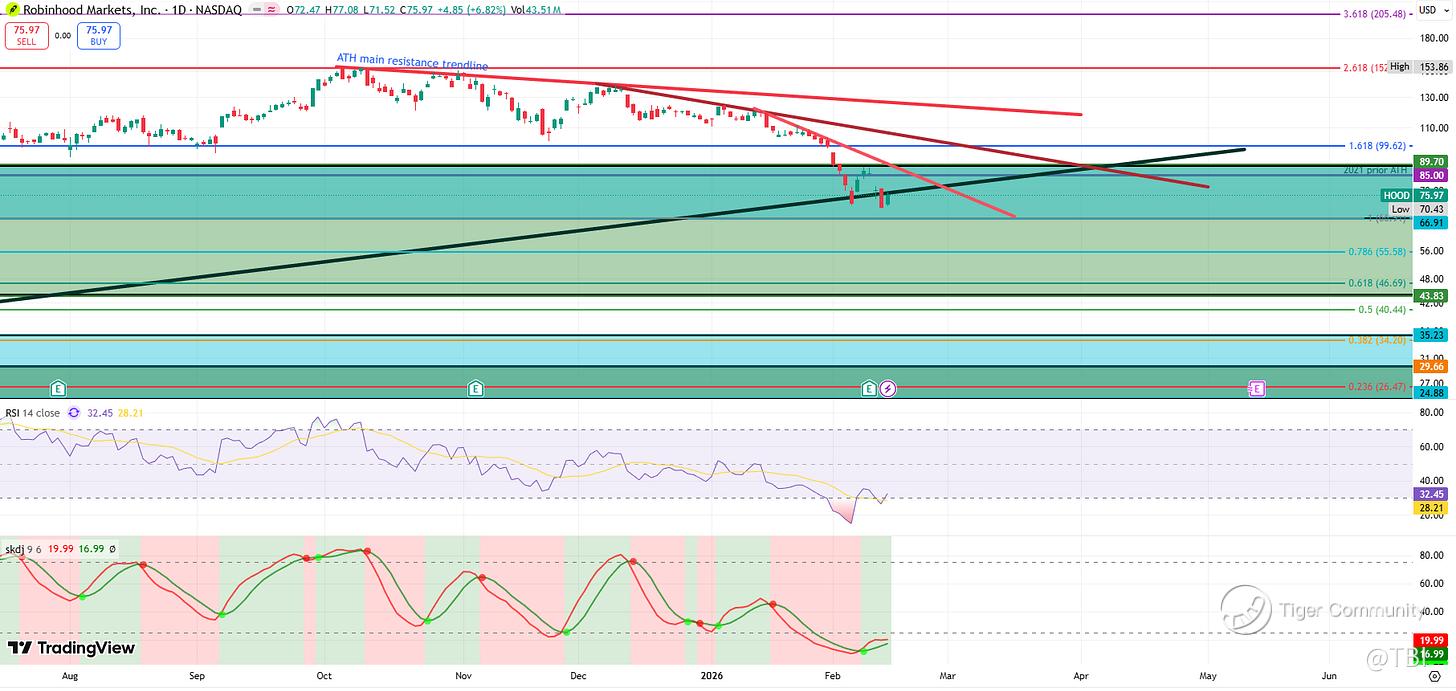 On the daily chart, HOOD closed just below this trendline, although there's a subtle bullish divergence present on RSI.