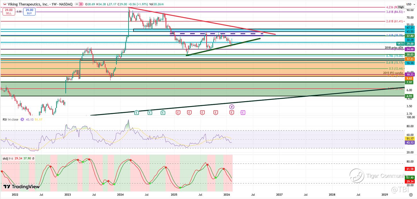 VKTX is compressing between the 38.29 Fib level and the 2018 prior ATH at 24. It's also bounded below the ATH red resistance trendline.