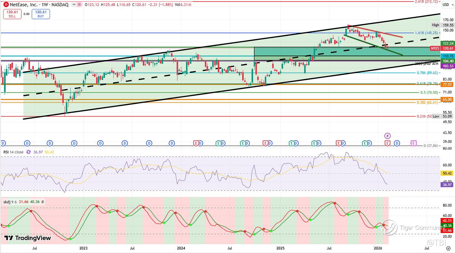 If NTES reclaims 122.24, then this descending support retest could have legs back into the red resistance trendline.