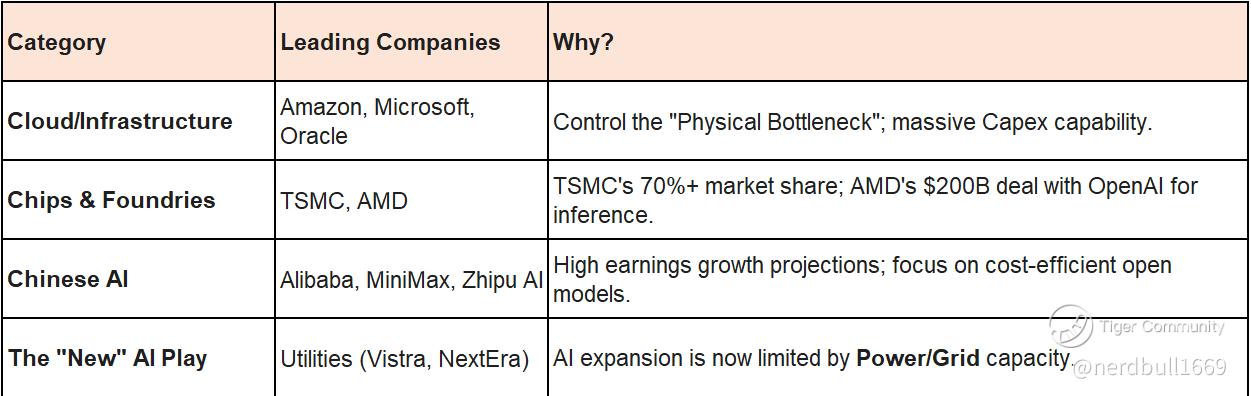 Energy & Power Players: Because power is now the primary bottleneck (not just chips), companies like Vistra and Constellation Energy are being treated as de facto AI stocks.
