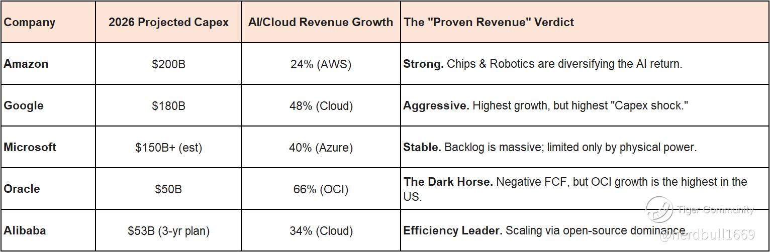 The market is no longer rewarding "AI potential"; it is rewarding Backlog Conversion. Oracle and Google are winning on growth rates, but Amazon is winning on the "Self-Sufficiency" story by using its own chips to offset the massive Capex bill.