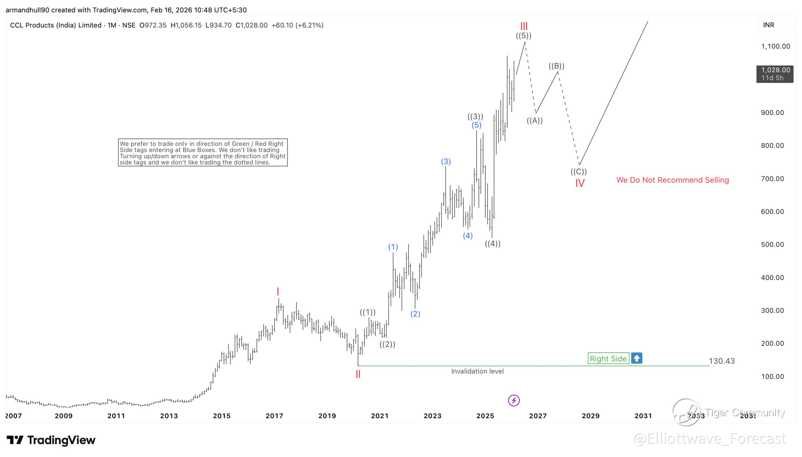 CCL Products appears close to completing Wave III. A three-swing Wave IV consolidation is likely next, followed by another bullish breakout in Wave V aligned with the long-term upward trend.