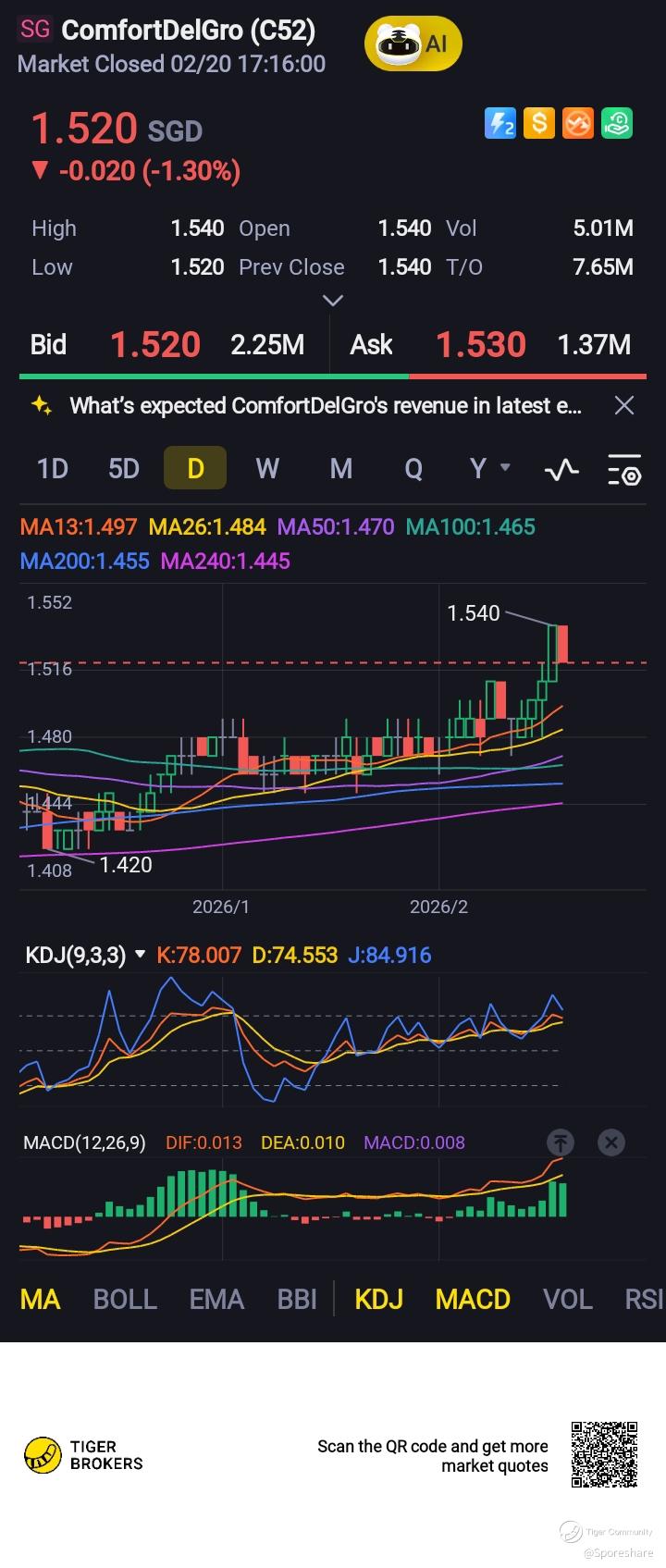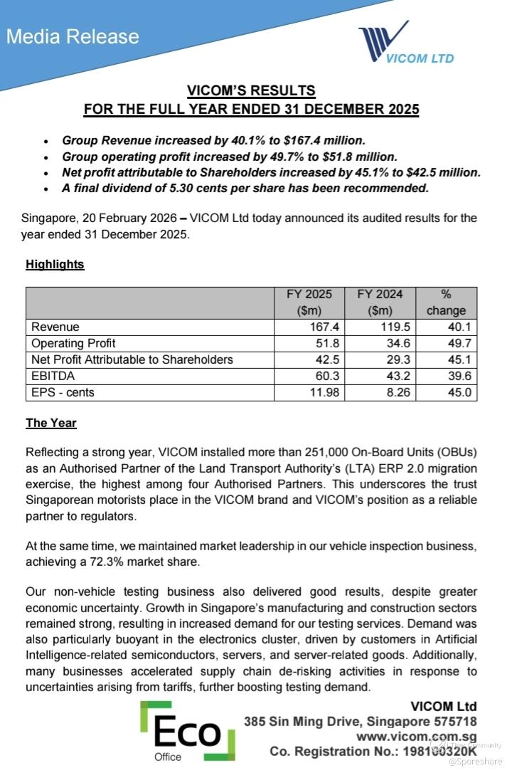 $ComfortDelGro(C52.SI) Hosey! With Vicom posted FY net profit increased 45.1% to 42.5m plus increased in Final dividend from 3 to 5.3 cents, ComfortDelGro likely benefit! Next week price may chiong up to test 1.60 and above! Sbs Transit results will be out on 24 February and ComfortDelGro on 27 Feb, dividend is coming, Awesome! https://sporeshare.blogspot.com/2026/02/comfortdelgro-she-is-gaining-strength.html