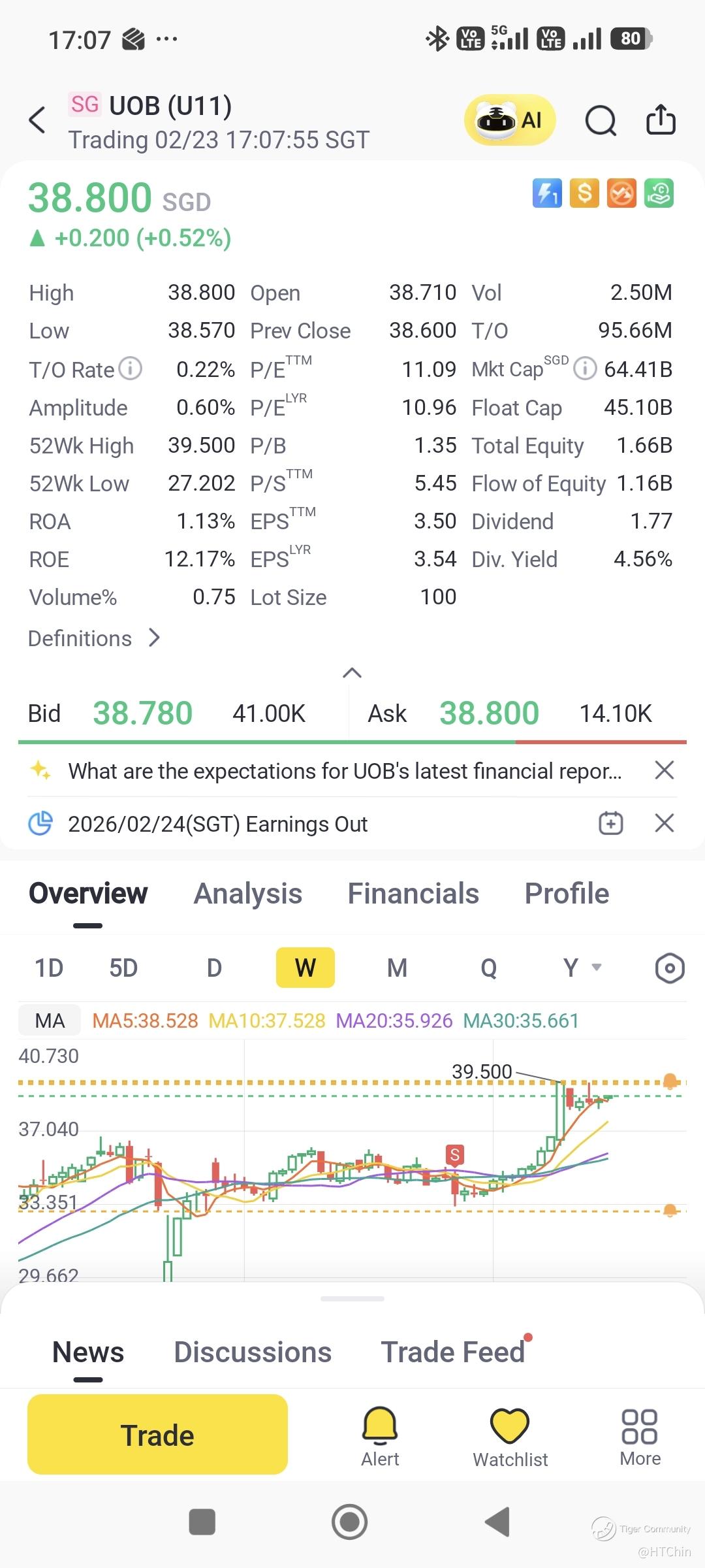 $UOB(U11.SI)$ Today closed at $38.80 and tomorrow will be a break ($40) or broke ($37) day depending on the 2025 financial results. Good luck 🍊 🍊