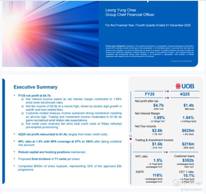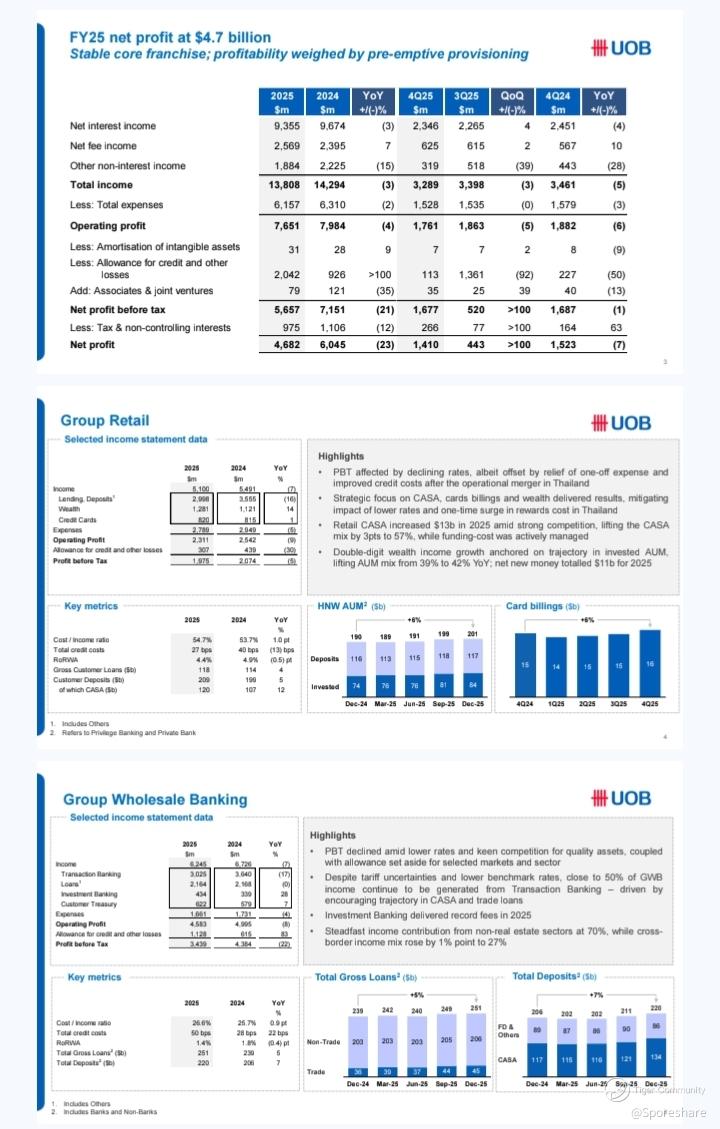 wholesale banking and retail banking businesses. Net profit for FY25 moderated 23% to S$4.7 billion from the previous year, largely due to the pre-emptive general allowances that the Group
