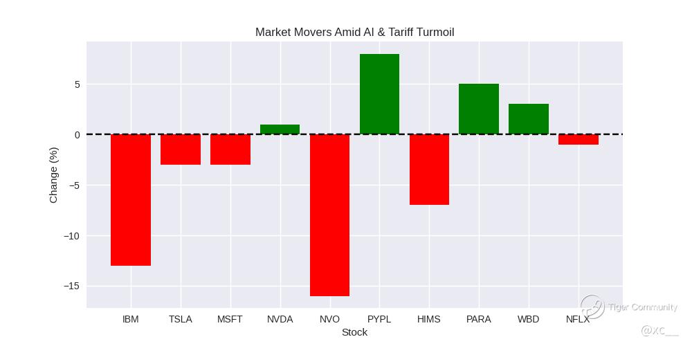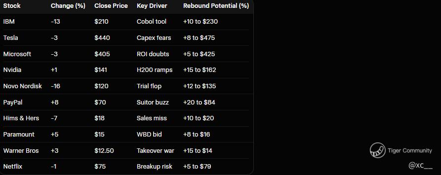 Wall Street wrapped lower as AI-disruption fears deepened alongside tariff uncertainty, with IBM plunging 13% to $210 on Anthropic's Cobol tool touting legacy code overhauls that threaten mainframe empires – this dive marks IBM's worst since 2000, wiping $20B in cap amid broader software apocalypse waves. Tesla and Microsoft dipped 3% to $440 and $405, as capex bloat and ROI doubts drag EV and cloud plays, while Nvidia bucked the trend up 1% to $141 on H200 ramps hinting semis resilience. Novo Nordisk stock tumbles 16% to $120 as next-gen obesity shot underperforms Lilly's tirzepatide, sparking healthcare rotation out of pharma giants amid trial flops crimp margins 10%. PayPal stock jumps after slump said to spark suitors' interest, surging 8% to $70 on buyout whispers adding $5B cap – this fintech revival heats M&A frenzy in payments amid retail slowdowns. Hims & Hers forecasts first-quarter sales below estimates, shares fall 7% to $18 on consumer crunch testing telehealth demand. Paramount submits higher offer for Warner Bros Discovery in bid to block Netflix, lifting PARA 5% to $15 and WBD 3% to $12.50 – this Hollywood war amps streaming synergies, but NFLX dips 1% to $75 on breakup fears. 😀🩸