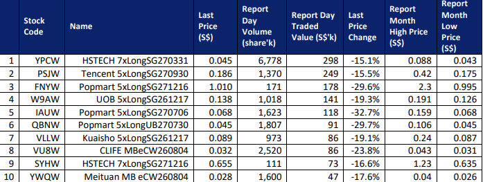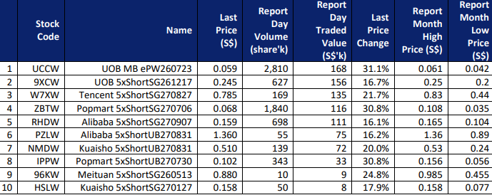 $HSTECH 7xLongSG270331(YPCW.SI)$ $Tencent 5xLongSG270930(PSJW.SI)$ $Popmart 5xLongSG271216(FNYW.SI)$ $UOB 5xLongSG261217(W9AW.SI)$ $Popmart 5xLongSG270706(IAUW.SI)$ $Popmart 5xLongUB270730(QBNW.SI)$ $Kuaisho 5xLongSG261217(VLLW.SI)$ $CLIFE MBeCW260804(VU8W.SI)$ $HSTECH 7xLongSG271216(SYHW.SI)$ $Meituan MB eCW260804(YWQW.SI)$