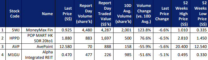 $MoneyMax Fin(5WJ.SI)$ $POP MART HK SDR 20to1(HPPD.SI)$ $AvePoint(AVP.SI)$ $Alpha Integrated REIT(M1GU.SI)$