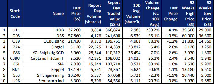 $UOB(U11.SI)$ $DBS(D05.SI)$ $OCBC Bank(O39.SI)$ $Singtel(Z74.SI)$ $YZJ Shipbldg SGD(BS6.SI)$ $CapLand IntCom T(C38U.SI)$ $SIA(C6L.SI)$ $Keppel(BN4.SI)$ $ST Engineering(S63.SI)$ $Sembcorp Ind(U96.SI)$