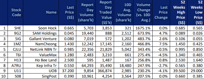$Soon Hock(SHE.SI)$ $SAM Holdings(9G2.SI)$ $Gallant Venture(5IG.SI)$ $NamCheong(1MZ.SI)$ $NetLink NBN Tr(CJLU.SI)$ $ValueMax(T6I.SI)$ $Ho Bee Land(H13.SI)$ $Kep Infra Tr(A7RU.SI)$ $UOB(U11.SI)$ $SingPost(S08.SI)$