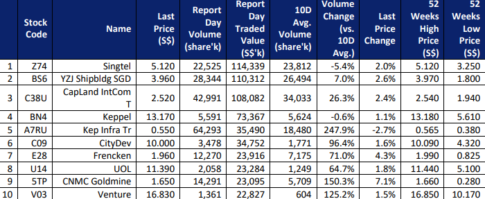 $Singtel(Z74.SI)$ $YZJ Shipbldg SGD(BS6.SI)$ $CapLand IntCom T(C38U.SI)$ $Keppel(BN4.SI)$ $Kep Infra Tr(A7RU.SI)$ $CityDev(C09.SI)$ $Frencken(E28.SI)$ $UOL(U14.SI)$ $CNMC Goldmine(5TP.SI)$ $Venture(V03.SI)$